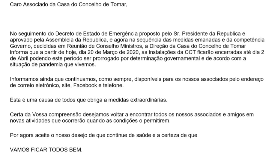 Encerramento das instalações devido ao cenário pandémico da Covid 19.